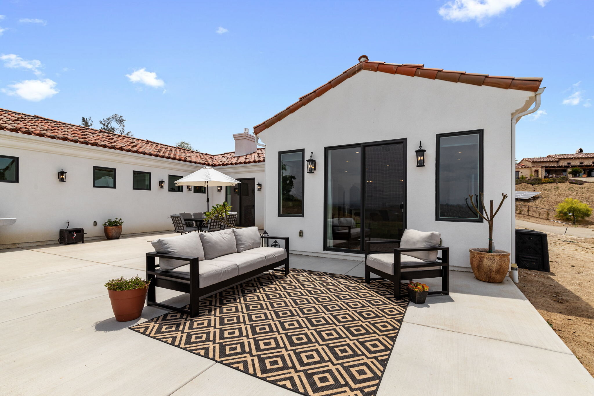 This client bought the lot for its view of the Escondido hills. We capitalized on that by creating a long facade where the Living Room, Dining Room, and Master Bedroom all have windows out to that view. There’s also an outdoor dining area sheltered from the wind but still facing that valley.
